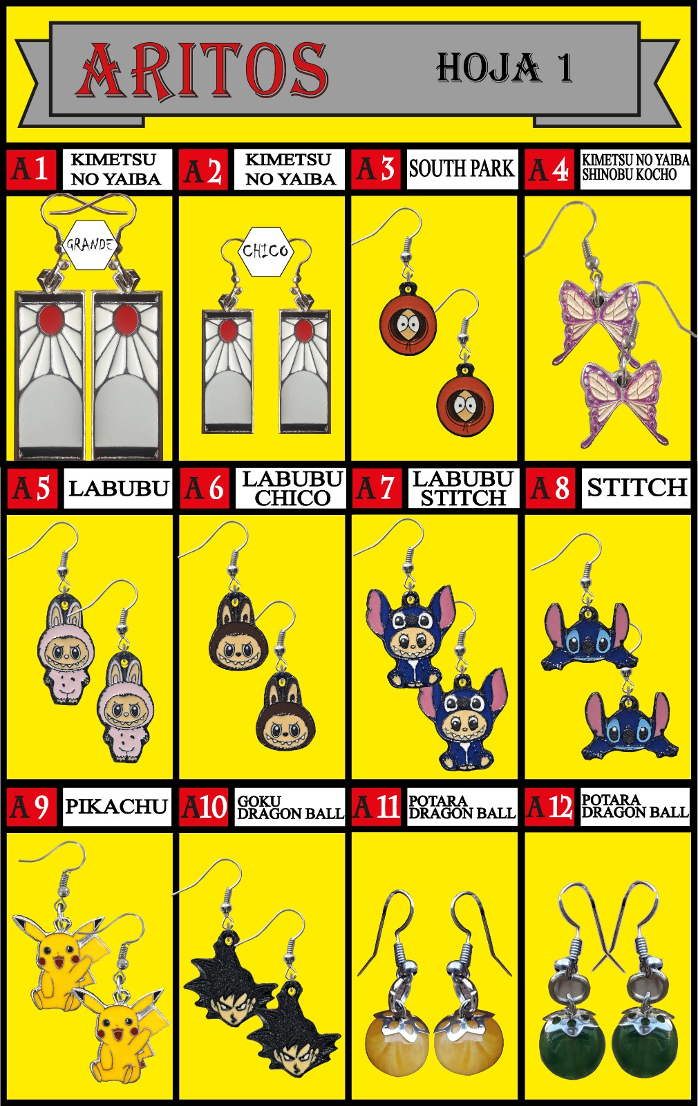Aros metal- Kimetsu-South park-Kocho-Labubu-Stitch-Pikachu-Dragon ball